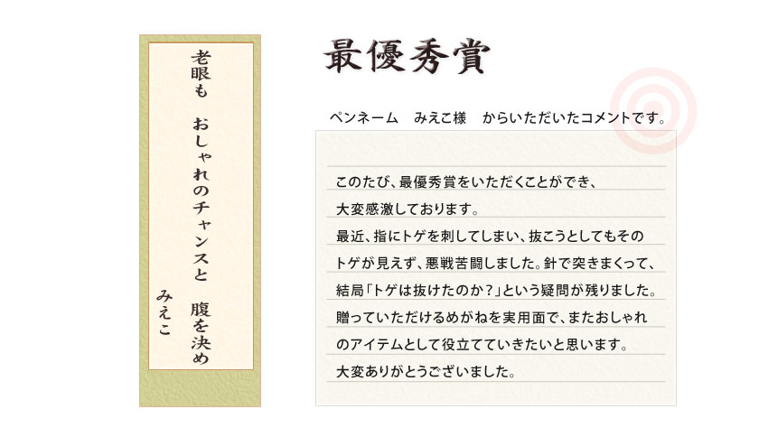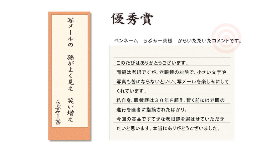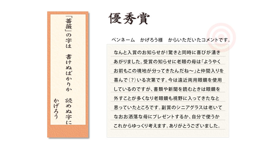 老眼・加齢に対して前向きな気持ちを詠んでいただいた作品が多く、選考させていただきましたスタッフ一同、晴れやかな気分で審査させていただきました。ご参加いただいた皆様、多数のご応募本当にありがとうございました。